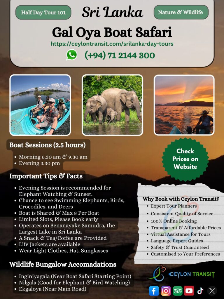Gal Oya National Park is unique among Sri Lanka’s national parks due to its vast reservoir, Senanayake Samudraya, which allows boat safaris—a feature unavailable in most other parks. Unlike Yala or Udawalawe, which are popular for high-density wildlife viewing (especially leopards in Yala and elephants in Udawalawe), Gal Oya offers a more peaceful, uncrowded experience, with a chance to see elephants swimming between islands, a spectacle unique in the country. Its lowland dry-evergreen forests and grasslands differ from Horton Plains’ montane grasslands or Wilpattu’s unique “Willus” (natural lakes). Birdlife is also richer than in some other parks, making it a prime destination for birdwatchers. In terms of accessibility, Gal Oya is less developed and more remote than Yala or Udawalawe, meaning fewer facilities and wildlife bungalows, but it compensates with tranquility and a close-to-nature safari experience. Overall, it is ideal for visitors seeking authentic wilderness, boat-based wildlife viewing, and off-the-beaten-path exploration.